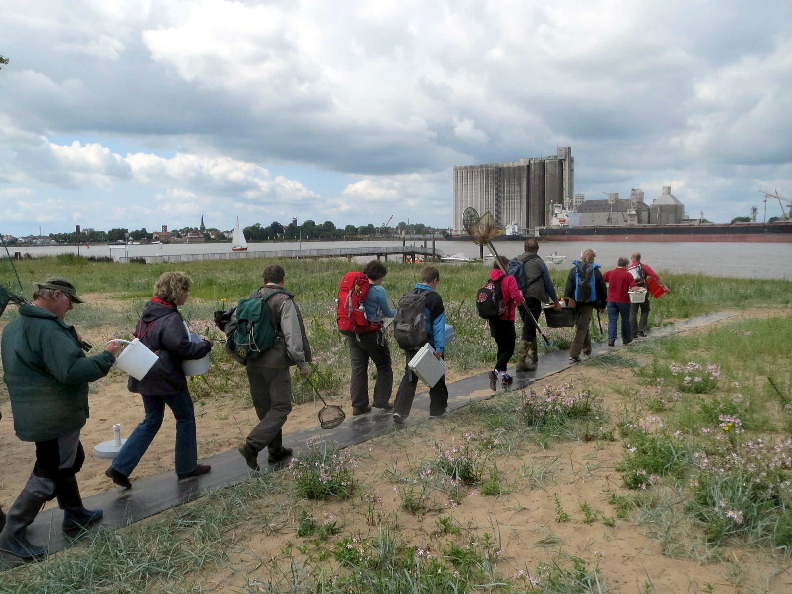 Zwischen zwei Regentagen fand an einem schönwettrigen Sonntag (26.7.15) unsere Fangexkursion auf Harriersand (Niedersachsen) statt. Es fanden sich 15 Teilnehmer mit Kescher und feinmaschigem Wadennetz ein. Matthias Hein von der FH Bremen brachte noch ein kleines Elektrofischereigerät zum Einsatz. Station 1 war die Weser, d.h. der Nordstrand von Harriersand am Fähranleger nach Brake. Das Wasser war bei Ebbe stark trübe und wies 1500 Mikrosiemens/cm und 22 °C auf, der Bodengrund ist hier sandig bis leicht schlickig. Station 2 war der obere Grabenabschnitt entlang der Inselstraße. Dieser Graben wird lediglich bei Extremhochwässern alle paar Jahre von Weserwasser geflutet. Hier wurden ca. 1400 Mikrosiemens/cm gemessen, also gar nicht so abweichend vom Weserwasser. Aber es war mit 26 °C stark von der Sonne durchglüht und es gab kaum Freiwasser, da stark zugewuchert mit Nuttalls Wasserpest.