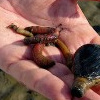Es gingen neben den Grundeln noch viele Nordseegarnelen Crangon crangon in die Netze, etwas überrascht und erfreut waren wir von nicht seltenen Einsiedlerkrebsen Eupagurus bernhardus, die wir bei der Suche nach Mollusken erst auf den zweiten Blick entdeckten. Beim Buddeln mit der Grabeforke fanden wir das Wissen eines Spezialisten für Mollusken unter uns bestätigt, dass einmal aus der Tiefe ausgegrabene Sandklaffmuscheln Mya arenaria ihren Körper nicht in ihre Schale zurückziehen können (wir setzten sie daher so zurück wie gefunden). Weiterhin wurden einige Wattwürmer Arenicola marina und Seeringelwürmer Nereis diversicolor ans Tageslicht geholt und ihre Wurmförmigkeiten und Gliedmaßen in Form von Hautbüscheln und Borsten betrachtet.