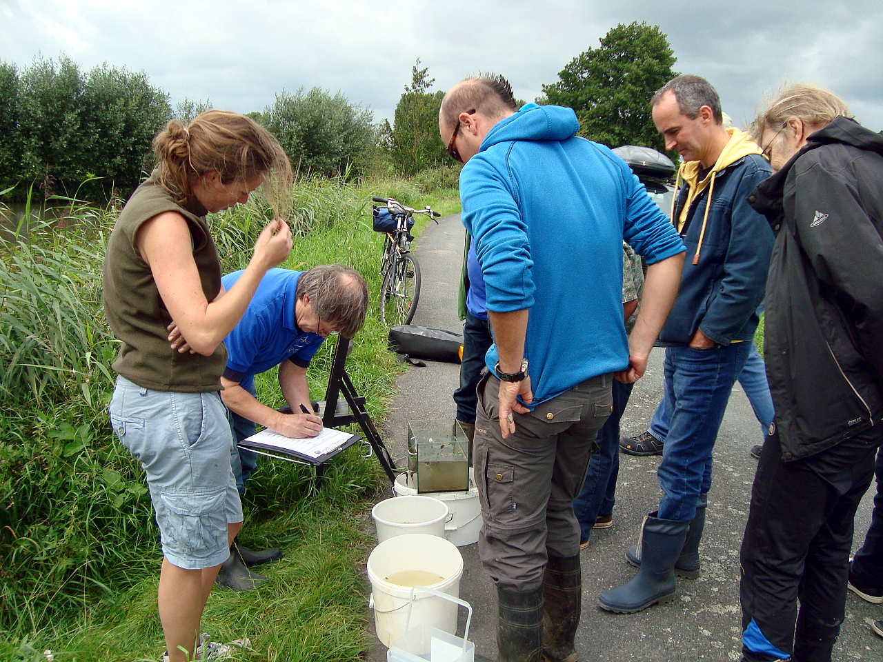 Anwesend waren Naturfreunde (überwiegend), Aquarianer, Angler und Fischkundler. An dieser Stelle bedanken wir uns für die Genehmigungen bei der Dienststelle des Senators für Umwelt (c/o Marion Riesner-Kabus) und beim FV Niedervieland e.V. (c/o Jochen Himmelskamp) für die Genehmigungen. Die Teilnehmer fischten mit Kescher, Senknetzen, Angeln und abschließend mit einem tragbaren Elektrofischereigerät mit Matthias Hein von Ecosurv Bremen am Auslöserknopf. Um es vorwegzunehmen: die erhofften Karauschen wurden nicht nachgewiesen, aber dafür einiges andere mehr, siehe unten.