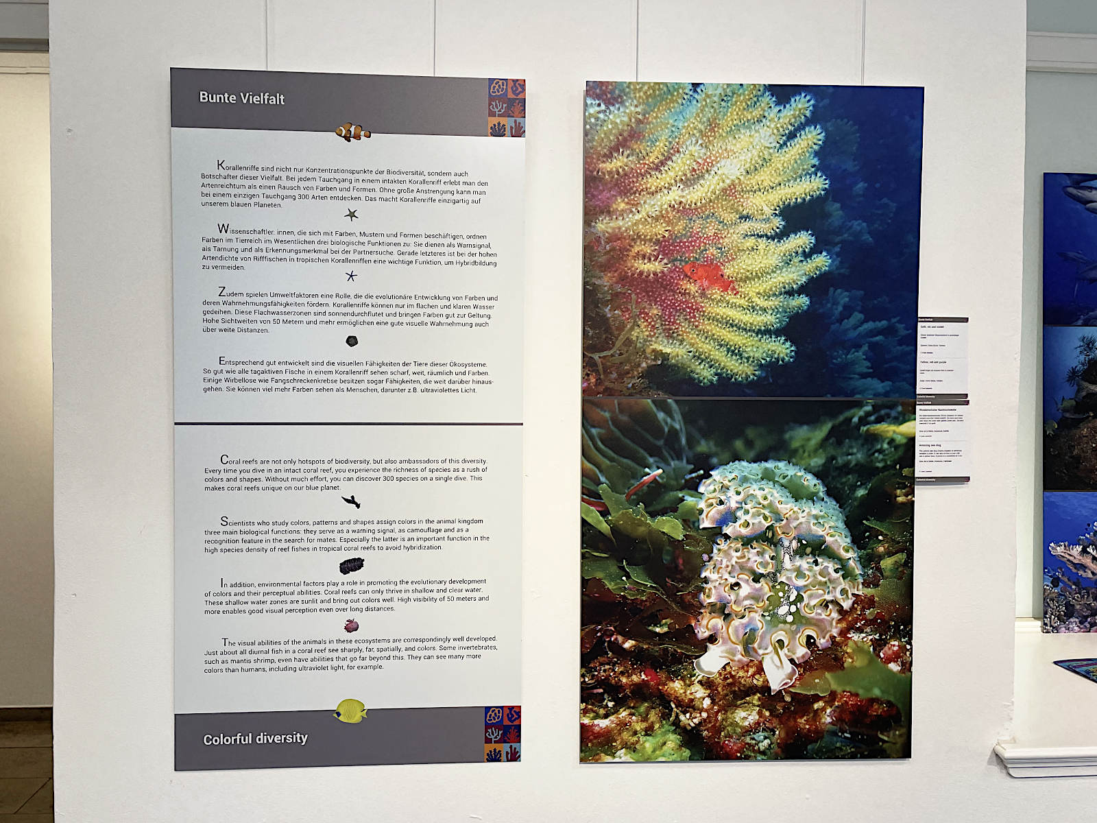 Impression zur ausleibaren Fotoausstellung "Bunte Vielfalt, weißer Tod - Was uns Farben über Korallenriffe verraten". Kurator: Heinz Krimmer (Berlin), zur Weltkorallenriff-Konferenzen (ICRS) 2021 und 2022. Wenn ihr bei euch ausstellen wollt, kontaktiert bitte Dr. Simon Jungblut (This email address is being protected from spambots. You need JavaScript enabled to view it.). Mehr >>